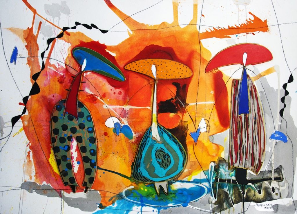 En esta exposición se plasma una serie de seres que se expanden en la mancha del papel y parte del muro, siendo una marca, un sello, una expansión de su propia identidad, de su propio tiempo. «Ellos aluden a tiempos pretéritos, como también al actual. Ellos están ‘entre tiempos'», explica Lourdes Naveillan.