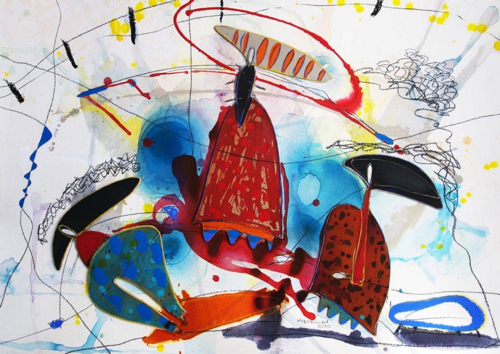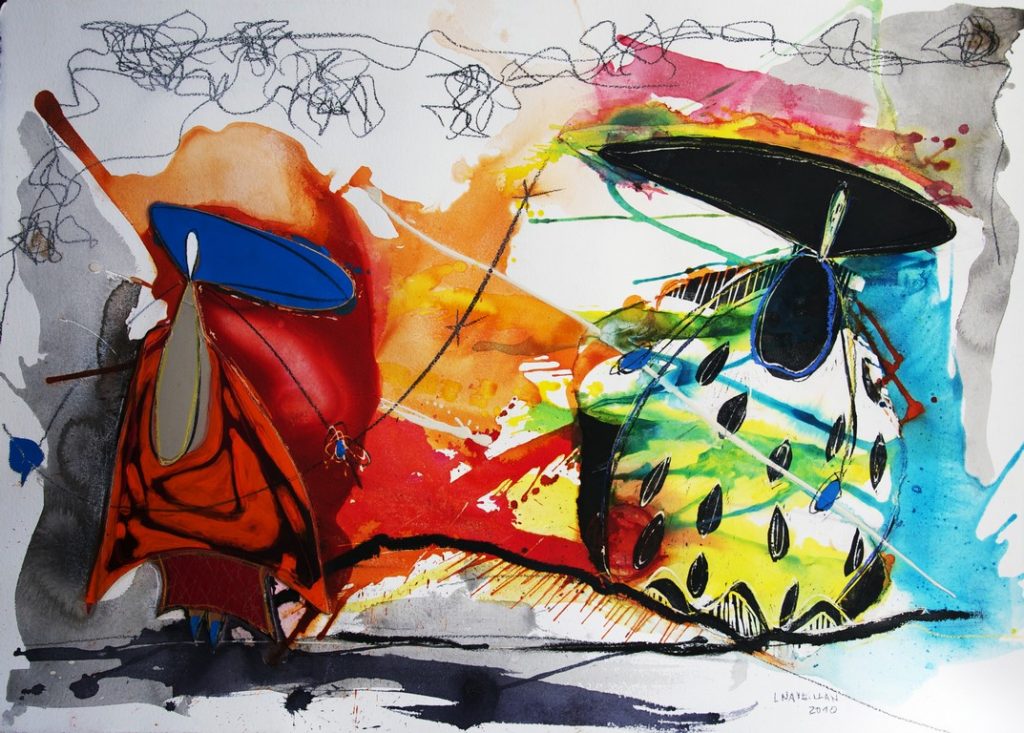 La muestra nace en tiempos de apuro, de conmoción, de velocidad, en el que una serie de acontecimientos surge muy rápidamente. «Entre tiempos» va más allá de lo literal, es el reflejo de una explosión visceral que expresa experiencias que se representan bajo la forma de personajes teatrales, lúdicos, coloridos, pendiendo de hilos. Cada uno en su universo, o en su historia, comparten las manchas, su espacio, su romanticismo. El agua forma a los personajes y estos se identifican con un mundo singular, único, en el cual se relacionan entre ellos, se definen y se acompañan.